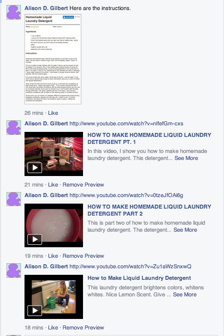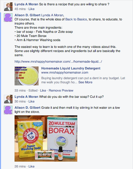 The above images from the facebook conversation. Below is the recipe from Mrs. Happy Homemaker for Homemade Liquid Laundry Detergent. She said, “Buying laundry detergent can put a dent in any budget. Let me walk you through and show you how . . .” Here is her recipe in writing.