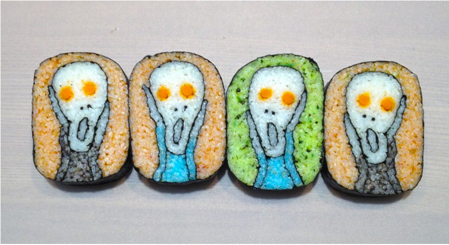 Although, to my knowledge, that tradition has not changed, there is no restriction on “making artistic makizushi (cooked rice, vegetables and/or seafood rolled into a seaweed wrap)”. Initially, Takayo Kiyota, the creator of the amazing work here, was mistaken for a man. But that is secondary to her art. She is a master at it, even if she has warm hands.