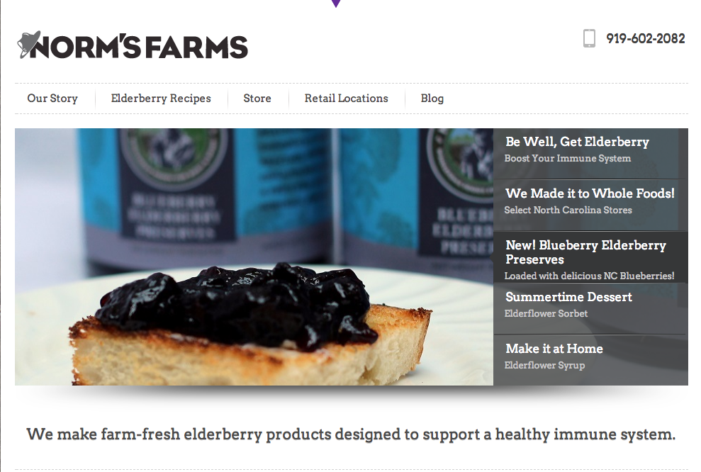 “Norm’s Farms, founded by Ann, Rodger, and Erin Lenhardt in Pittsboro, NC, is a way of carrying on Norm’s work and vision. The Norm’s Farms family believes in the sustainable production of healing foods made with natural, simple ingredients–just like the elderberries Norm’s Farms grows. Because the Norm’s Farms family recognizes that their small Missouri farm cannot keep up with the company’s demand, they have begun working with small family farmers in North Carolina to help establish elderberry orchards. Norm’s Farms will have a local source of elderberries for their products in addition to those grown in Missouri.”