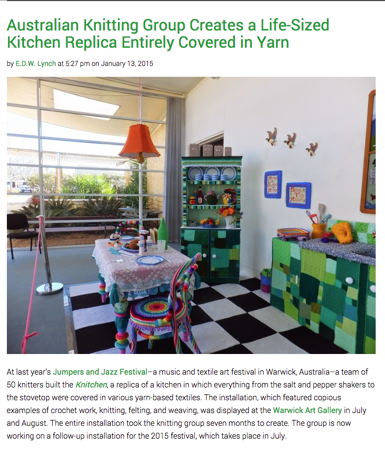 At last year’s Jumpers and Jazz Festival–a music and textile art festival in Warwick, Australia–a team of 50 knitters built the Knitchen, a replica of a kitchen in which everything from the salt …Source:laughingsquid.com