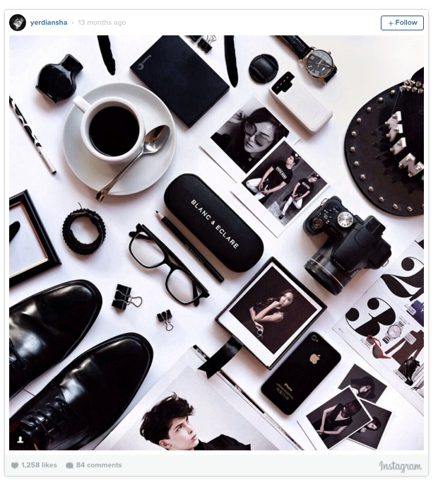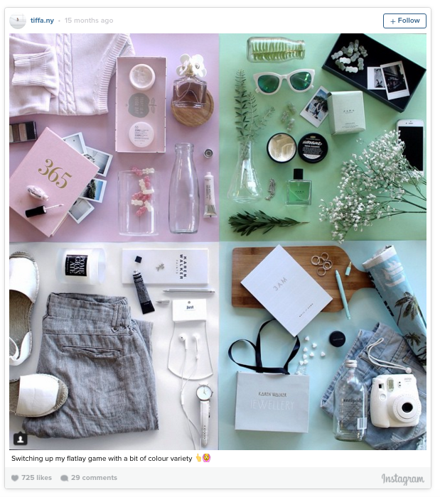 It seems to have started as the former and morphed into the latter over time. ‘Flatlays’ or ‘flat lay photography’ has nothing to do with knolling as a systematic method of organization. But from the way I understand these terms, they can be used as a record of knolling a set of objects. It can also be an art form of pleasantly laid out objects. It is presently and widely used on Instagram, tumblr and Pinterest. The purpose of using these social media applications is a popular means of graphic design layout or brand marketing as shown below. Instagram photos used in an article on Business Insider called, Everyone’s obsessed with ‘knolling’ their stuff and putting the photos on Instagram